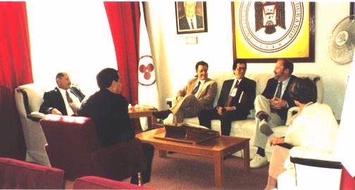 With [left to right] Esteban Hernandez (General Director of Mexican Institutes of Technology),Jesus Ruvalcaba (Chancellor of the Instituto Tecnologico de Durango),Emiliano Hernandez (Mexican Secy. of Education), Prof. Job Favela Diaz , and a veryhelpful translator, at the Annual Meeting of the Directors of Institutes of Technology; Instituto Tecnologico de Durango, Durango, Mexico October, 1996.